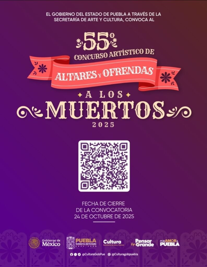 El Gobierno del Estado de Puebla, a través de la Secretaría de Arte y Cultura, anunció la apertura de la convocatoria para la 55ª edición del tradicional Concurso Artístico de Altares y Ofrendas a los Muertos, uno de los eventos más representativos de la temporada que busca preservar las tradiciones mexicanas y reconocer la creatividad y talento de las y los poblanos.