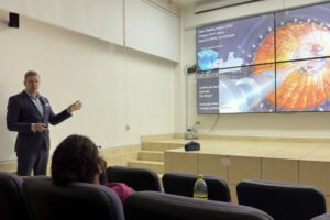 Como parte de su agenda, el vocero del CERN impartió un seminario dirigido al cuerpo académico de Partículas Elementales, fortaleciendo el intercambio científico y la cooperación internacional.