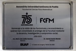 La Facultad de Ciencias Físico Matemáticas (FCFM) de la Benemérita Universidad Autónoma de Puebla (BUAP) concluyó las actividades conmemorativas por su 75 aniversario con la develación de una placa alusiva, acto que marcó el cierre de una serie de celebraciones dedicadas a reconocer su trayectoria académica, científica y formativa dentro de la institución.