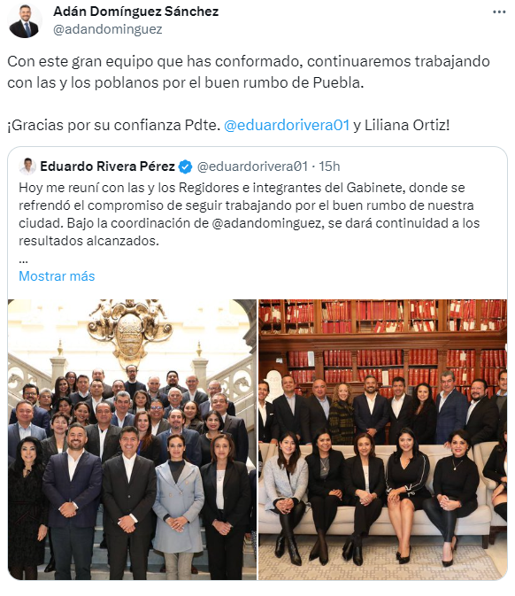 Y, en ese tenor, el aún edil sostuvo una reunión con los regidores e integrantes de su gabinete para dar salida a los últimos detalles antes de que deje el puesto. En un mensaje que compartió en redes sociales dejó claro que será su gerente, Adán Domínguez, quien se quede con la batuta para gobernar lo que resta del periodo en la ciudad de Puebla.