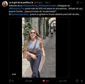 La delegada de Bienestar en Puebla, Natalia Suárez del Real, pasó en cuestión de días de una celebración privada a convertirse en tendencia nacional. Primero por su fiesta temática inspirada en El Gran Gatsby; después, por la difusión en redes sociales de los precios de algunos de sus accesorios personales, señalados como artículos de alta gama. Lo que comenzó como un debate sobre una celebración con estética asociada al lujo terminó convirtiéndose en una conversación más amplia sobre coherencia política y discurso de austeridad.