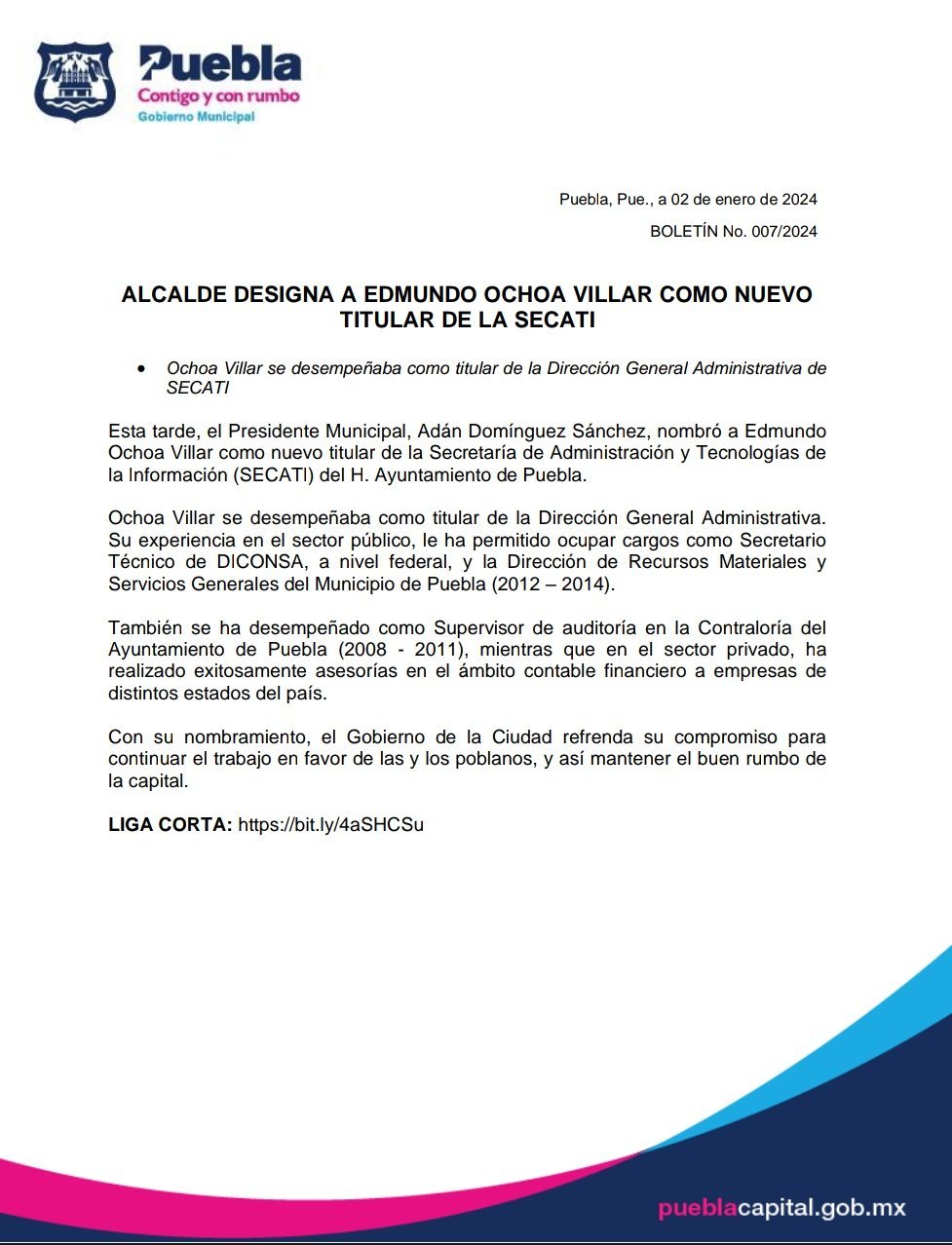 El ayuntamiento de Puebla anunció que en su lugar fue asignado Edmundo Ochoa Villar, quien aparentemente ascendió de puesto. Ochoa estaba a cargo de la Dirección General Administrativa y ahora subió unos peldaños que lo colocan en la SECATI.