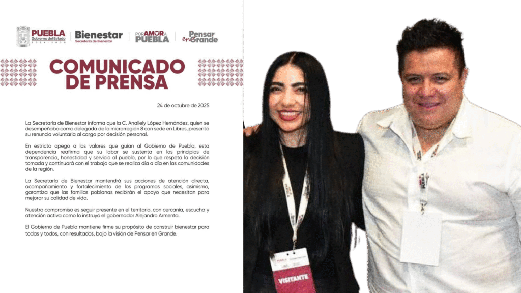 Puebla, Pue.— La Secretaría de Bienestar del gobierno estatal confirmó que Anallely López Hernández, delegada regional en la microrregión 8 con sede en Libres, presentó su renuncia “por decisión personal” el miércoles 22 de octubre, horas después de que su nombre apareciera ligado a Nazario Ramírez Ramírez, señalado por autoridades federales como operador con vínculos con el Cártel Jalisco Nueva Generación (CJNG).