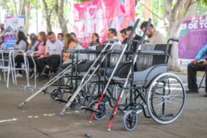 Los apoyos entregados incluyeron 20 auxiliares auditivos de última generación, 32 sillas de ruedas —entre ellas modelos especiales para distintas necesidades—, 20 bastones, 13 pares de muletas y 5 andaderas.