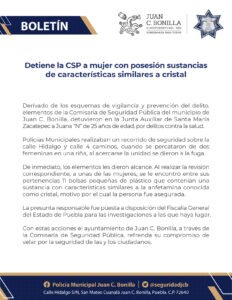 Juan C. Bonilla, Pue. — Derivado de los esquemas de vigilancia y prevención del delito implementados por la administración municipal, elementos de la Comisaría de Seguridad Pública (CSP) detuvieron a una mujer en posesión de sustancias con características similares a la droga conocida como cristal.