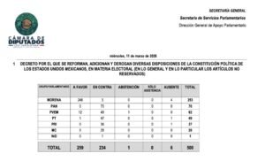 La iniciativa enviada por el Ejecutivo fue votada en la Cámara de Diputados de México, donde obtuvo 259 votos a favor, 234 en contra y una abstención, resultado que impidió alcanzar la mayoría calificada requerida para modificar la Constitución.