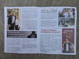 De acuerdo con reportes y material que circula en la región, se trata de una publicación tipo gaceta —de cuatro páginas— que ha sido distribuida en distintas zonas del municipio, en la que aparece la dirigente en imágenes junto al gobernador Alejandro Armenta Mier, además de incluir referencias a acciones de gobierno y programas públicos, así como la imagen de la presidenta de México Claudia Sheinbaum.