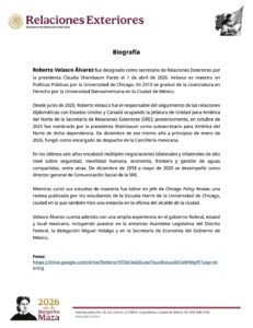 Velasco Álvarez, quien actualmente se desempeña como subsecretario para América del Norte, cuenta con una trayectoria enfocada en la diplomacia: