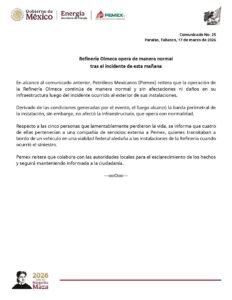 La empresa explicó que, tras fuertes lluvias, se generó un derrame de aguas aceitosas —mezcla de agua con residuos de combustibles— que se acumuló en el exterior de la barda perimetral y posteriormente se incendió.